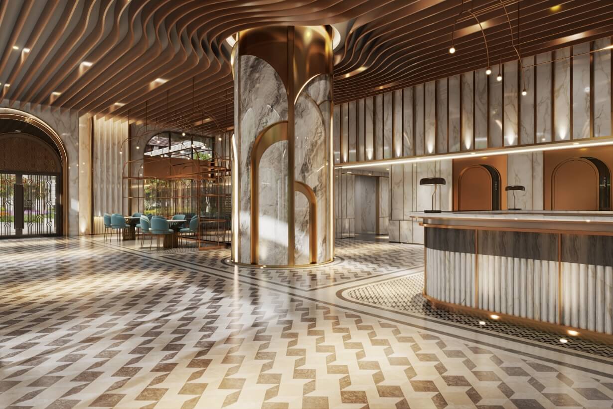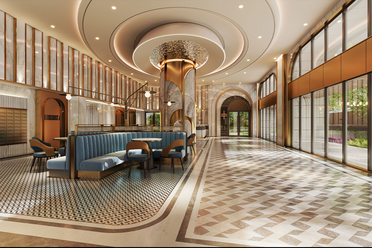 一道道弧形拱門及金屬飾材相互搭配,宛如藝術殿堂般精緻,勾勒出空間的層次與尊榮感,搭配光影設計,呈現低調卻雋永的奢華質感。