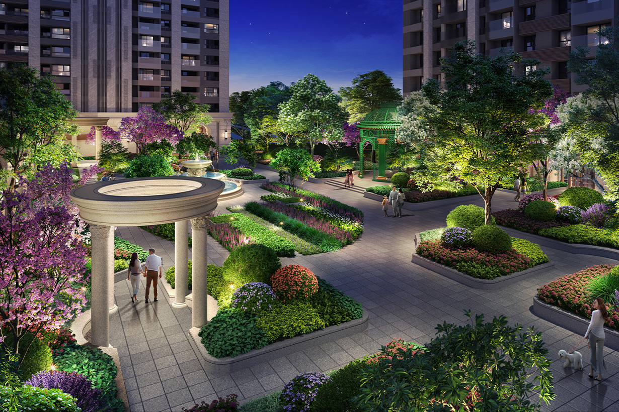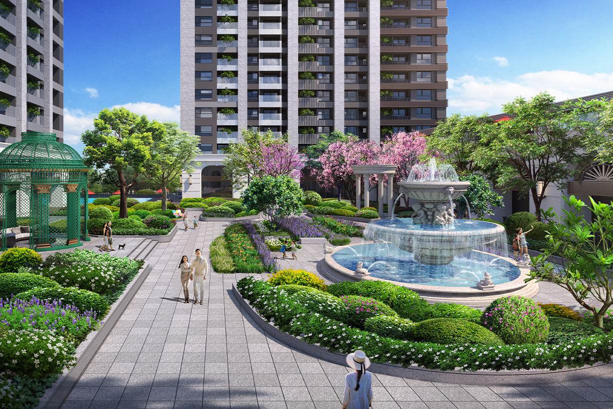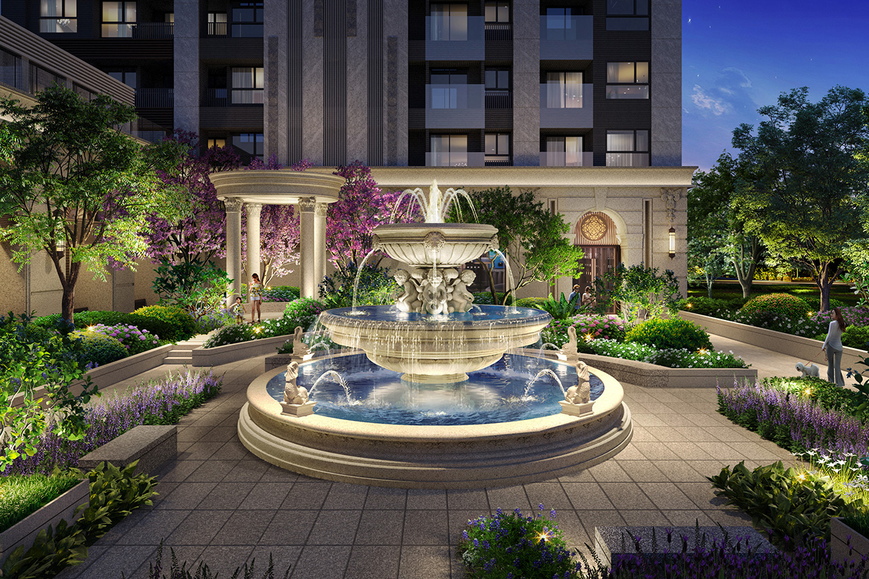 打造都市中少見的千坪中庭花園,私享一片城市綠境,歐式噴泉水池及繽紛四季花藝相互呼應,營造如同宮廷花園般的藝術庭園。